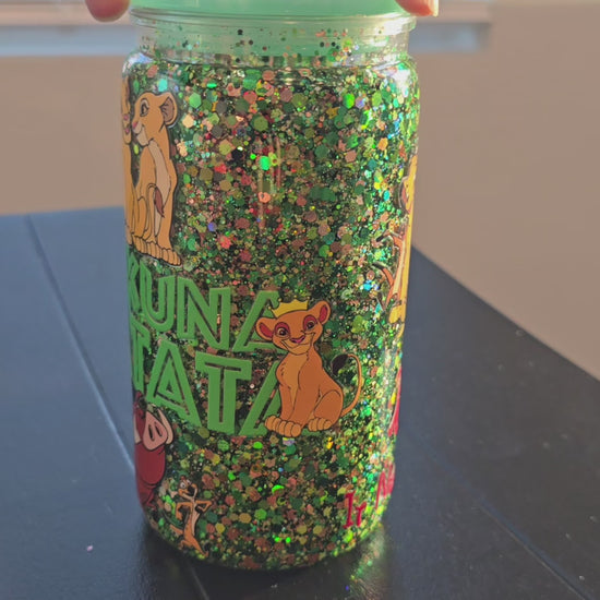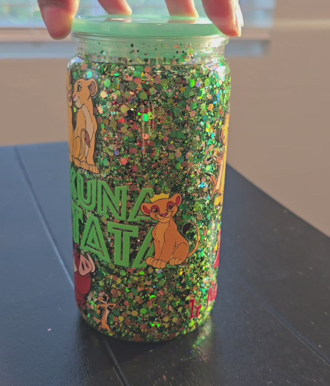 Premade 16oz Acrylic glitter snowglobe. LionKg. Green lid included